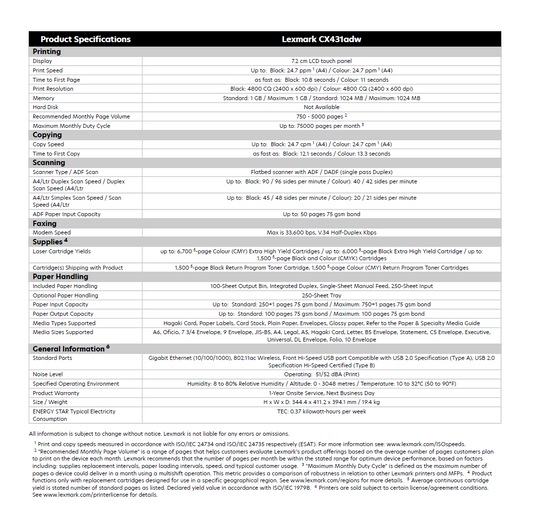 CX431 adw Lexmark Printer bundle with Additional CMYK Toner set.