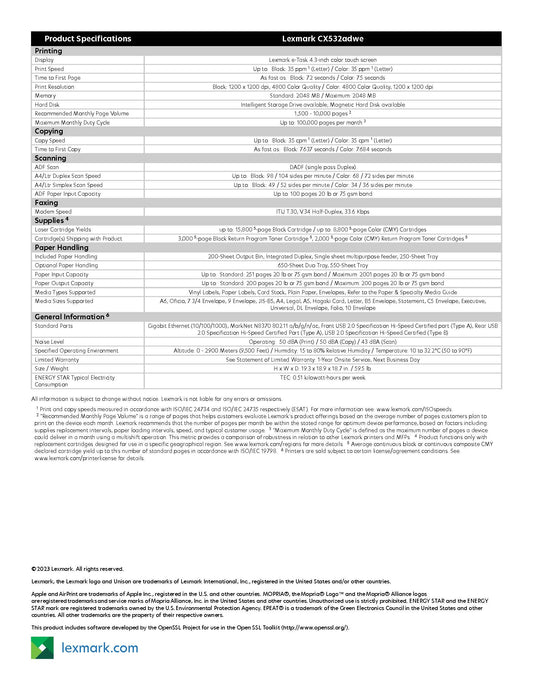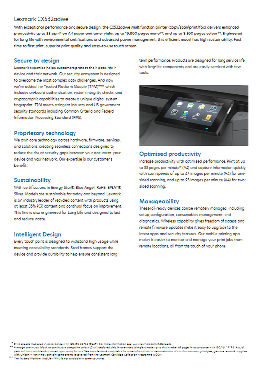 CX532adwe Lexmark A4 Multi Function Printer 3 year On-site warranty.